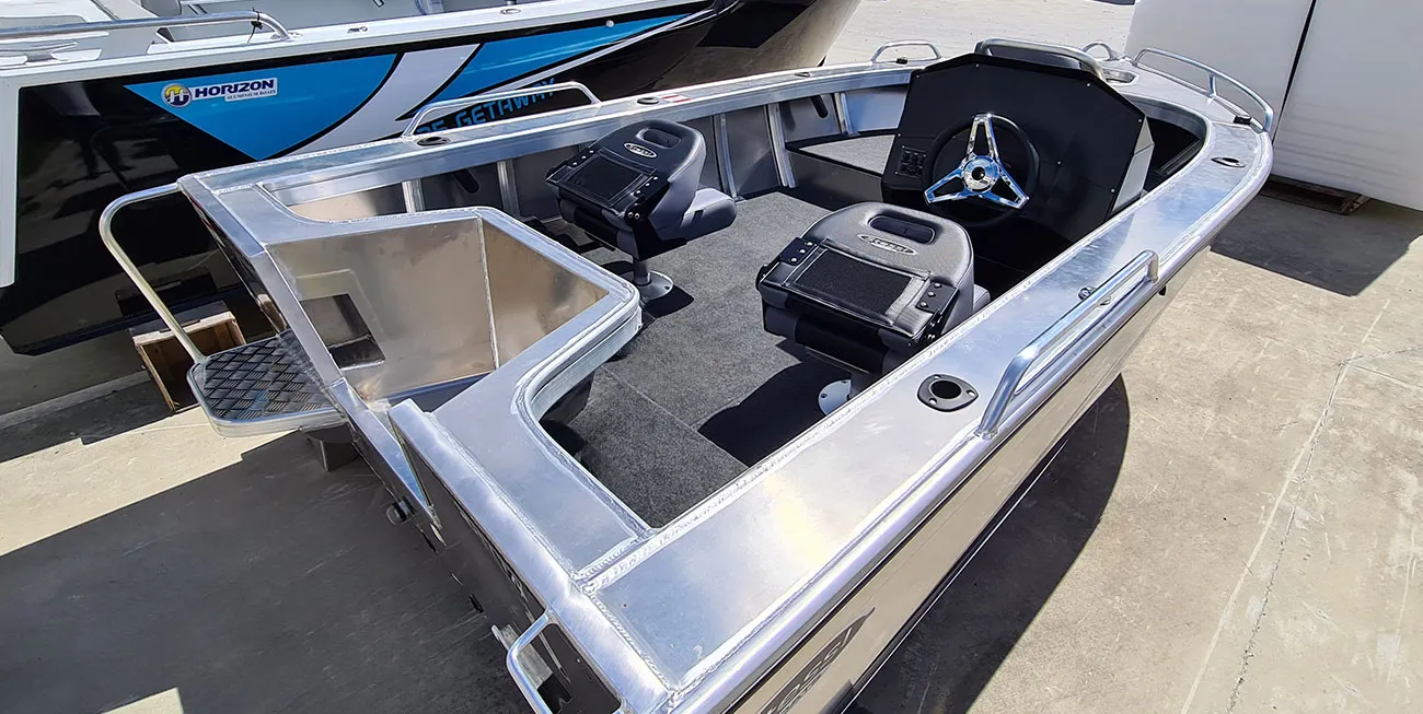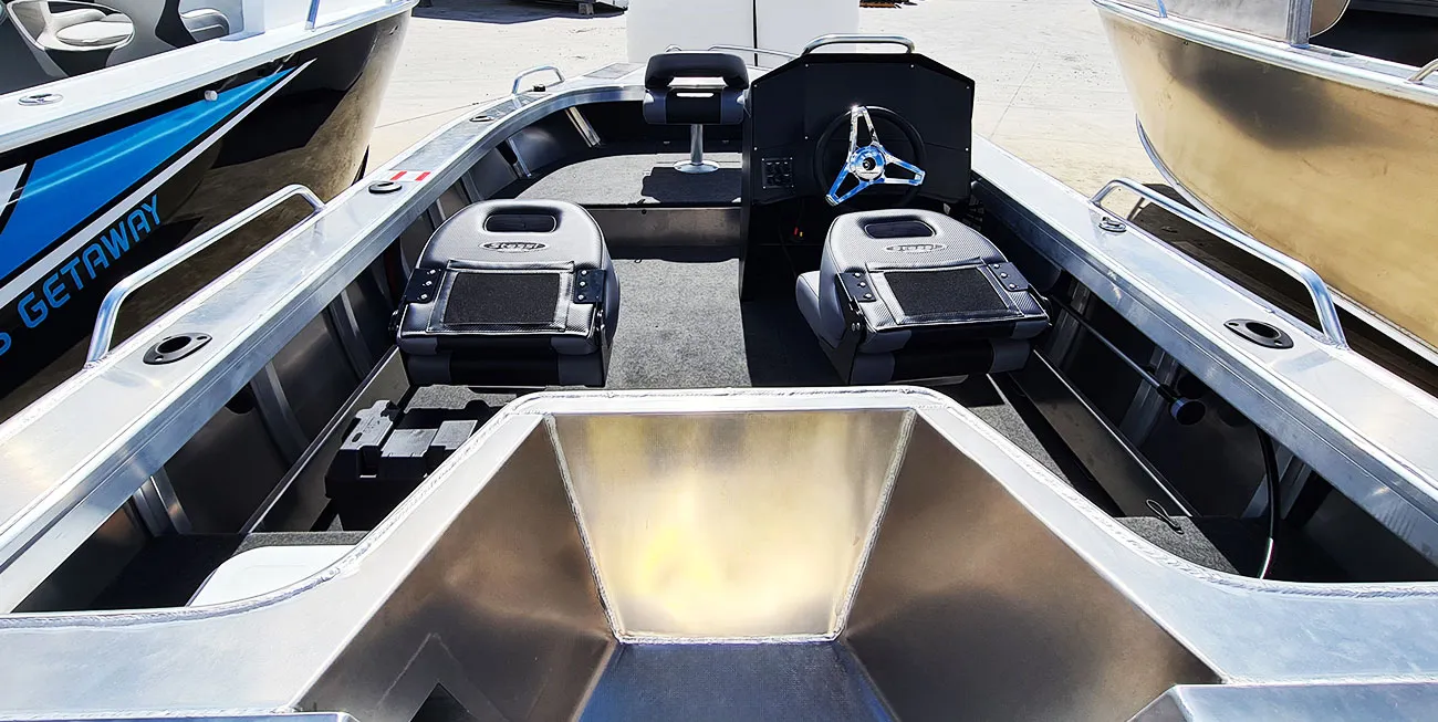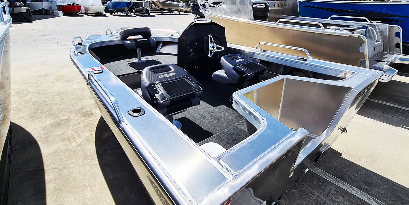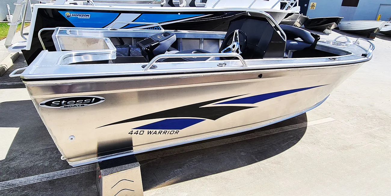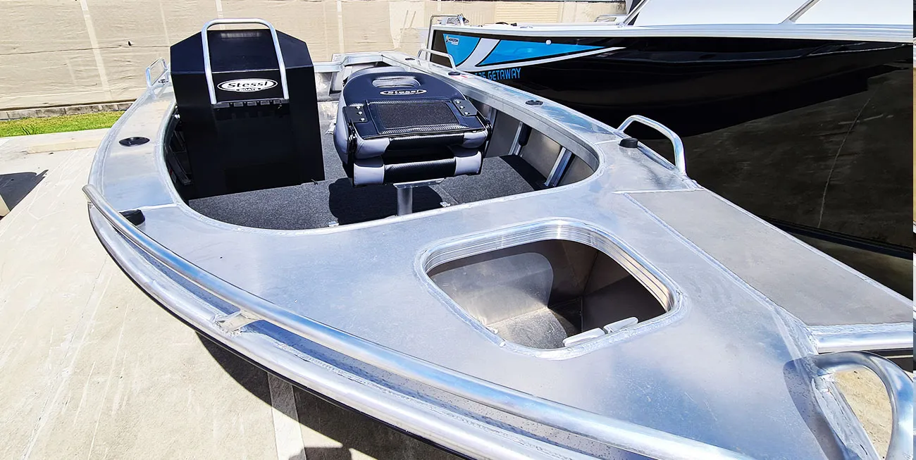 The Stessl Aluminium Pressed Boats Warrior Side Console is designed with the angler in mind, featuring a full-height motor well, a live bait tank, and spacious casting decks at both the front and rear.